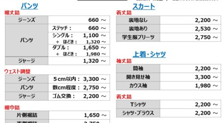 思い出の服、お気に入りの服の裾上げ、袖丈詰、ウェストサイズ調整、ボタン付け、ファスナー交換、破れ修理、等を承ります。